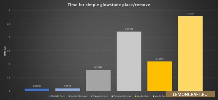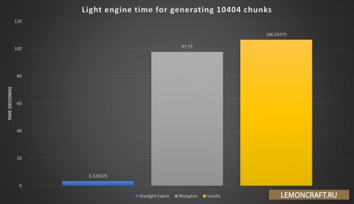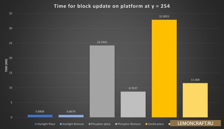 Мод на звездный свет Starlight отлично подойдет на замену моду Phosphor, ведь он полностью переработает движок стандартного ванильного освещения. На графиках вы можете увидеть значительное увеличение производительности игры по сравнению с модом Phosphor.